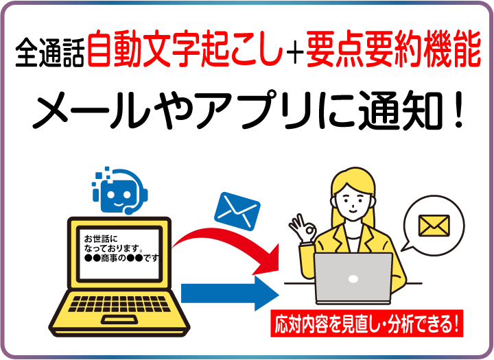AIがお客様応対した内容を、わかりやすく要約化し、通話原文の文字起こしと一緒に、人間スタッフへ、メールやアプリに通知します。 また、実際の通話音声データも確認・再生できます。