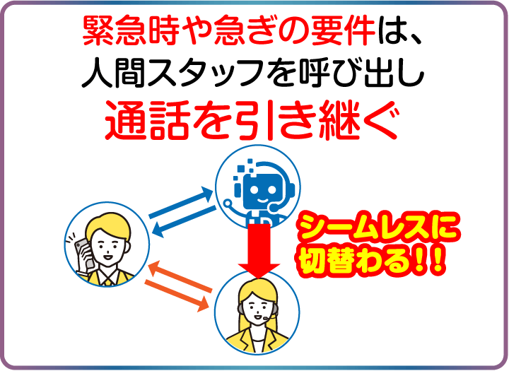 AIでは応対できない内容や、緊急の問合せの場合、AIが通話を保留し、ログイン中の人間スタッフへ即時通知。 そのまま通話をスタッフが引き継げる機能です。
