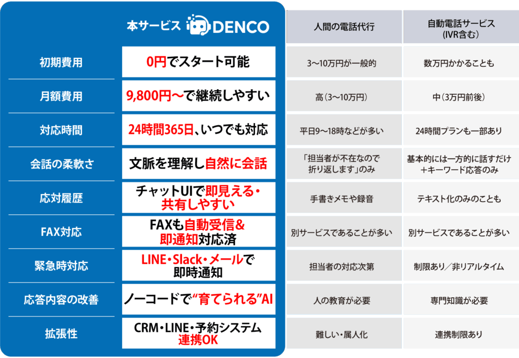 他社のデモを使いましたが、使いこなせずに断念しましたが、 DENCOなら、本当に丸投げで、すぐにAI電話が使えるように なりました。